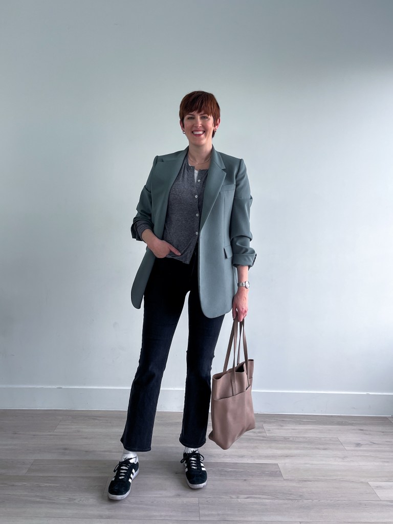 Lastly, I like mixing informal and tailor-made collectively to make an sudden combo. Right here, I went super-sporty with the cargo joggers and sneakers, so I added a workwear type cardigan. This, to me, is the right informal Friday within the workplace outfit.