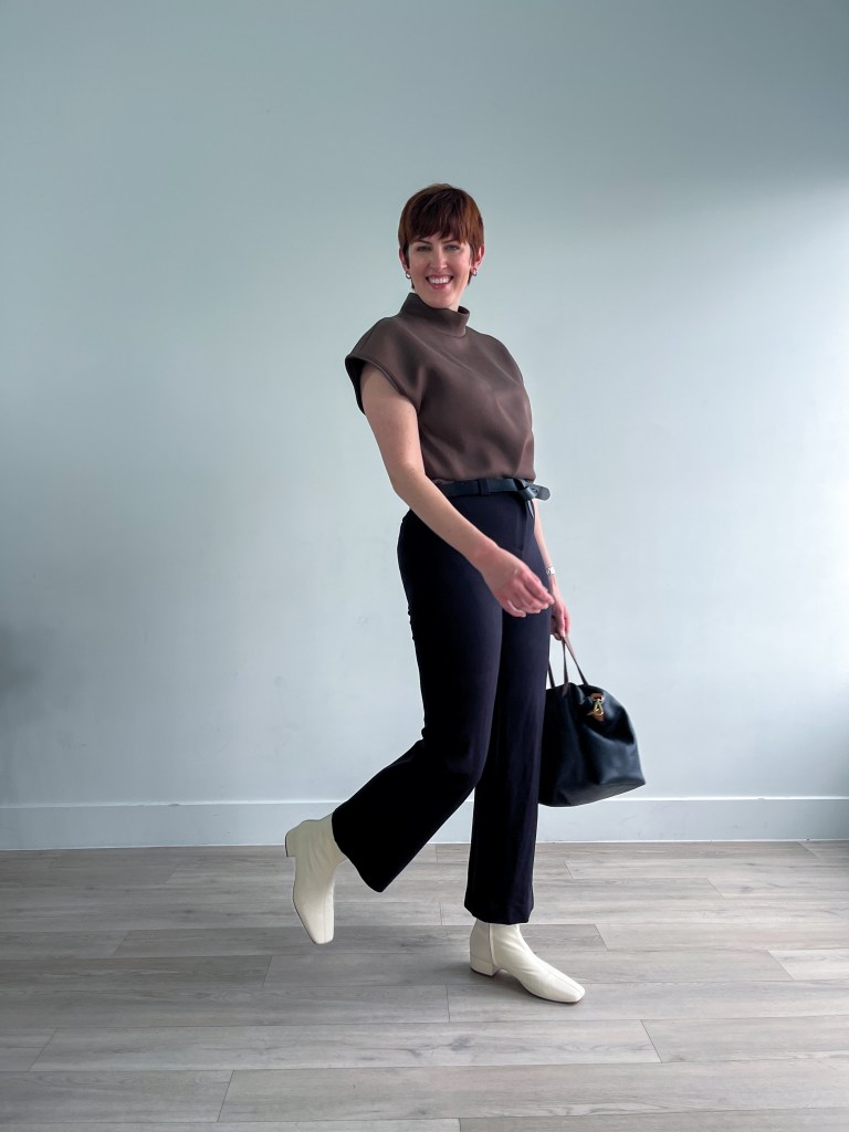 Subsequent, an outfit that positively wants a coat to go exterior, however is ideal for educating in boiling-hot buildings. This excessive neck shell is my new favourite confidence merchandise. It appears so sharp underneath a blazer! However, I additionally adore it right here as an sudden strategy to break up a black and white educating outfit.