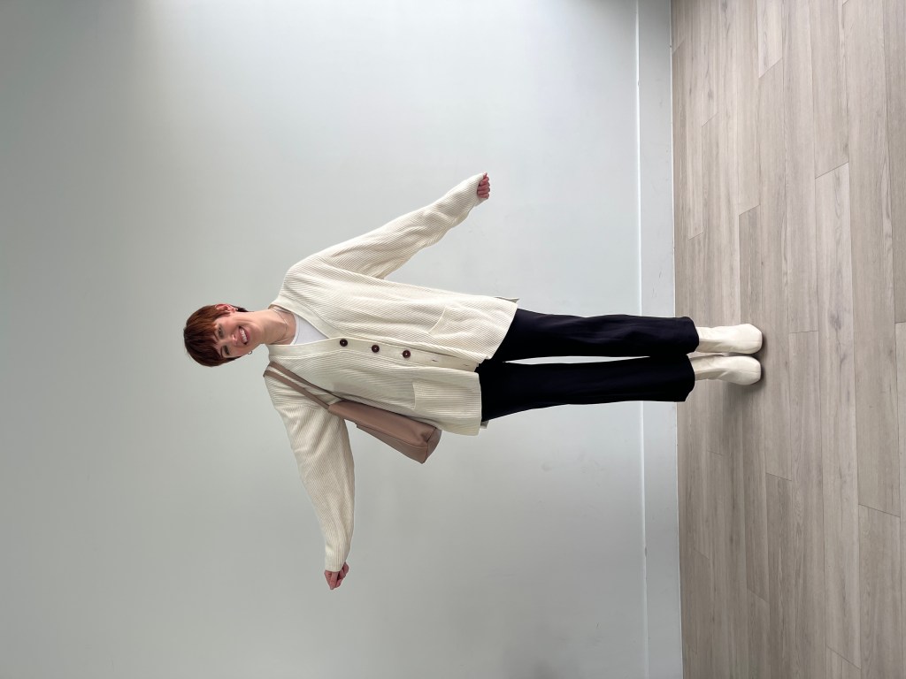I like a professor outfit that looks like a hug in chilly climate, and that’s precisely how I really feel on this ginormous cardigan. I layered it with an extended sleeve tee and added white ankle boots for an additional little bit of power.