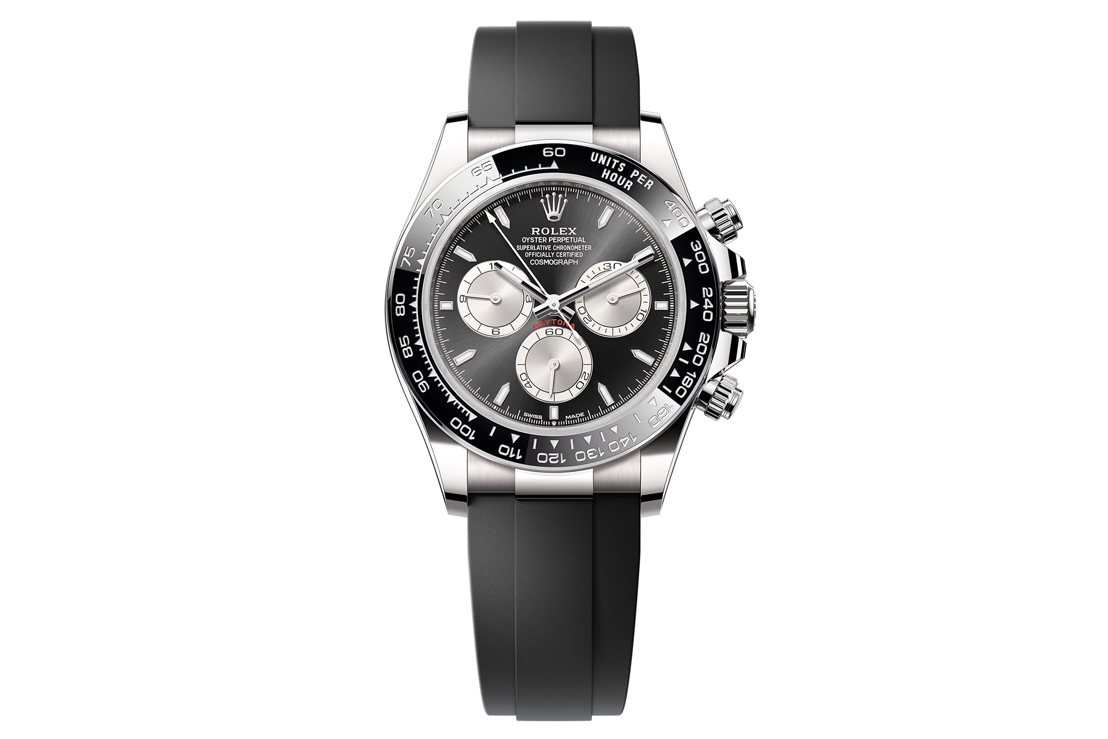 The Rolex Daytona Ref. 126529LN. 40mm in diamter, 100m of water resistance through screw-down crown and screw-down pushers. Black dial, reverse-panda design with white registers. Cerachrom bezel with purple ingredient. White gold case and bracelet, and bracelet with Rolex Simple-Hyperlink adjustment system. Exhibition caseback that includes COSC-certified Superlative Chronometer caliber 4131 with 72 hours of energy reserve. Worth: $51,400.